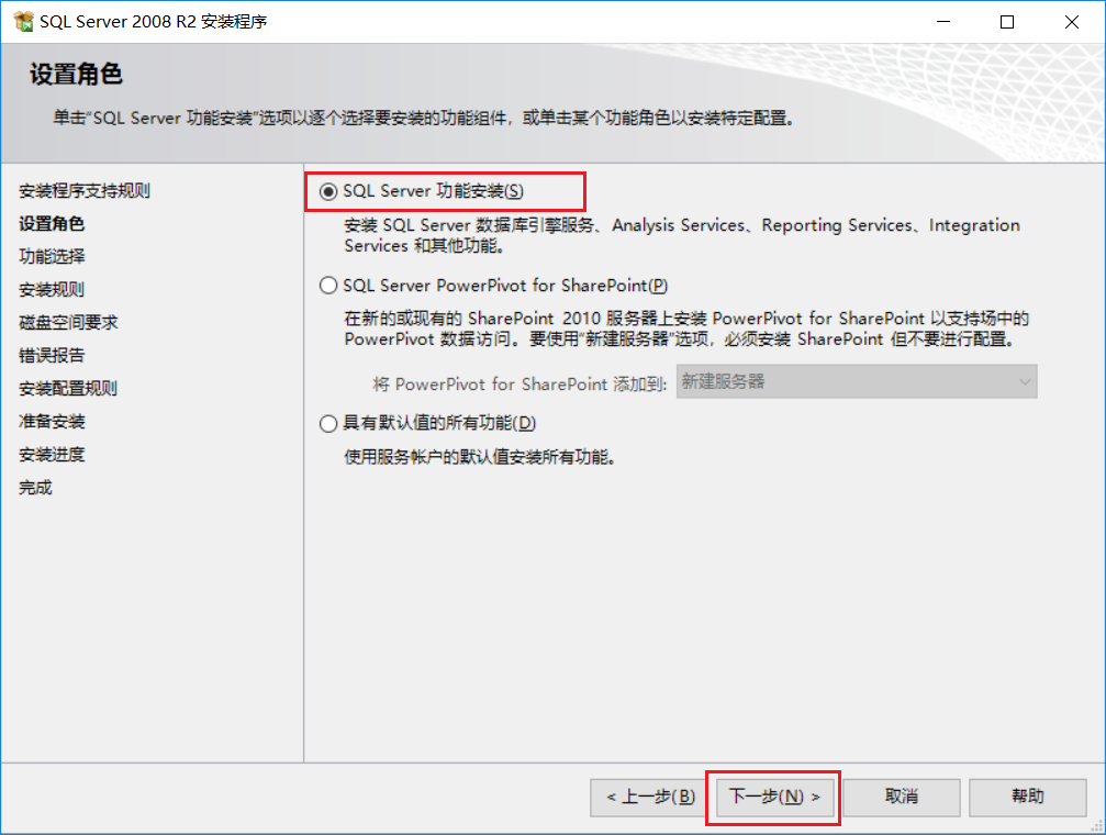 選擇 SQL Server功能安裝 ,點擊 下一步
