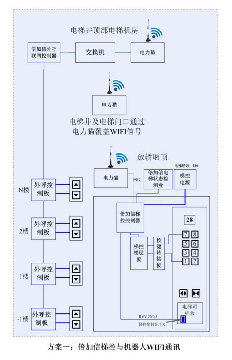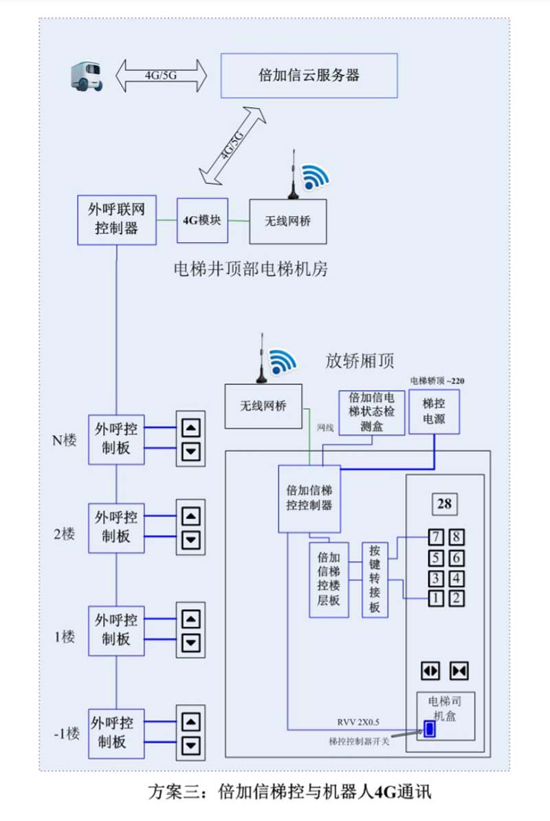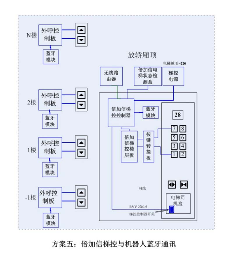 (1)機器人在電梯外,通個Wifi、藍牙、LoRa、Zigbee、2.4G、433M、語音或4G網絡等發(fā)送指令倍加信梯控系統(tǒng),系統(tǒng)自動點亮上樓或下樓按鍵,實現(xiàn)呼梯功能。