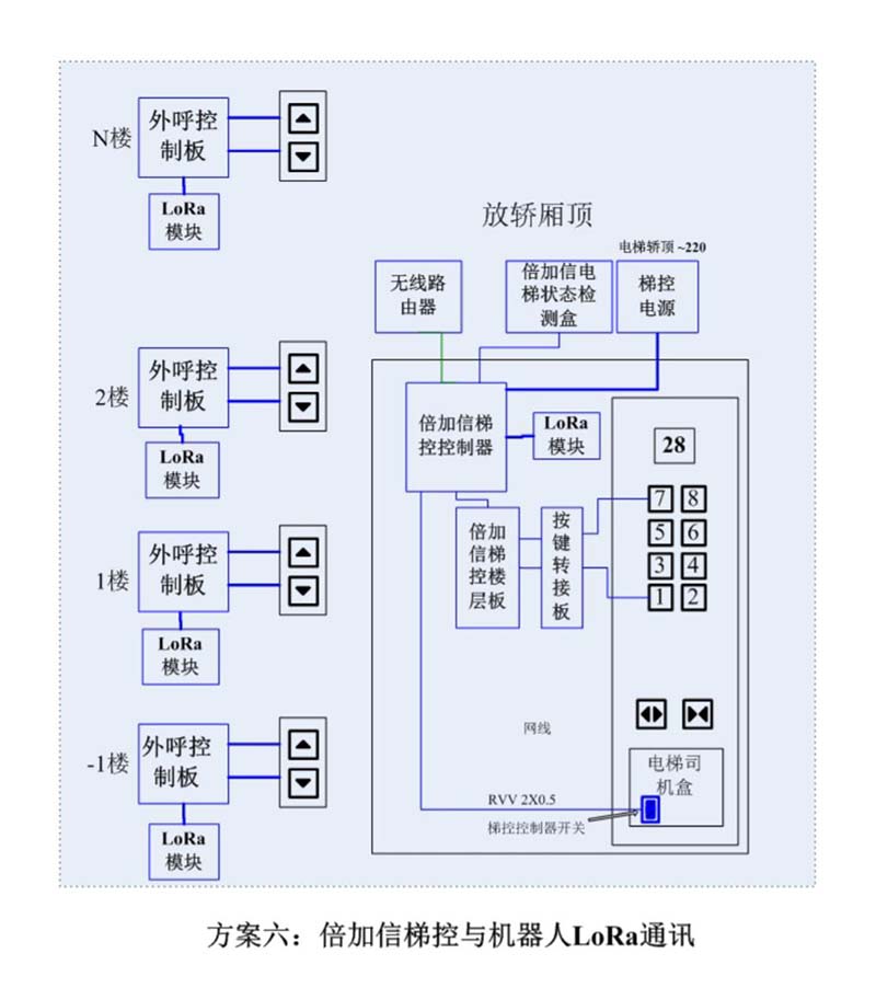 (1)機器人進入電梯后,通個Wifi、藍牙、LoRa、Zigbee、2.4G、433M、語音或4G網絡等發(fā)送給倍加信梯控系統(tǒng),系統(tǒng)自動點亮對應樓層按鍵,比如發(fā)去6樓指令,則6樓按鍵自動點亮,電梯送機器人員到6樓。